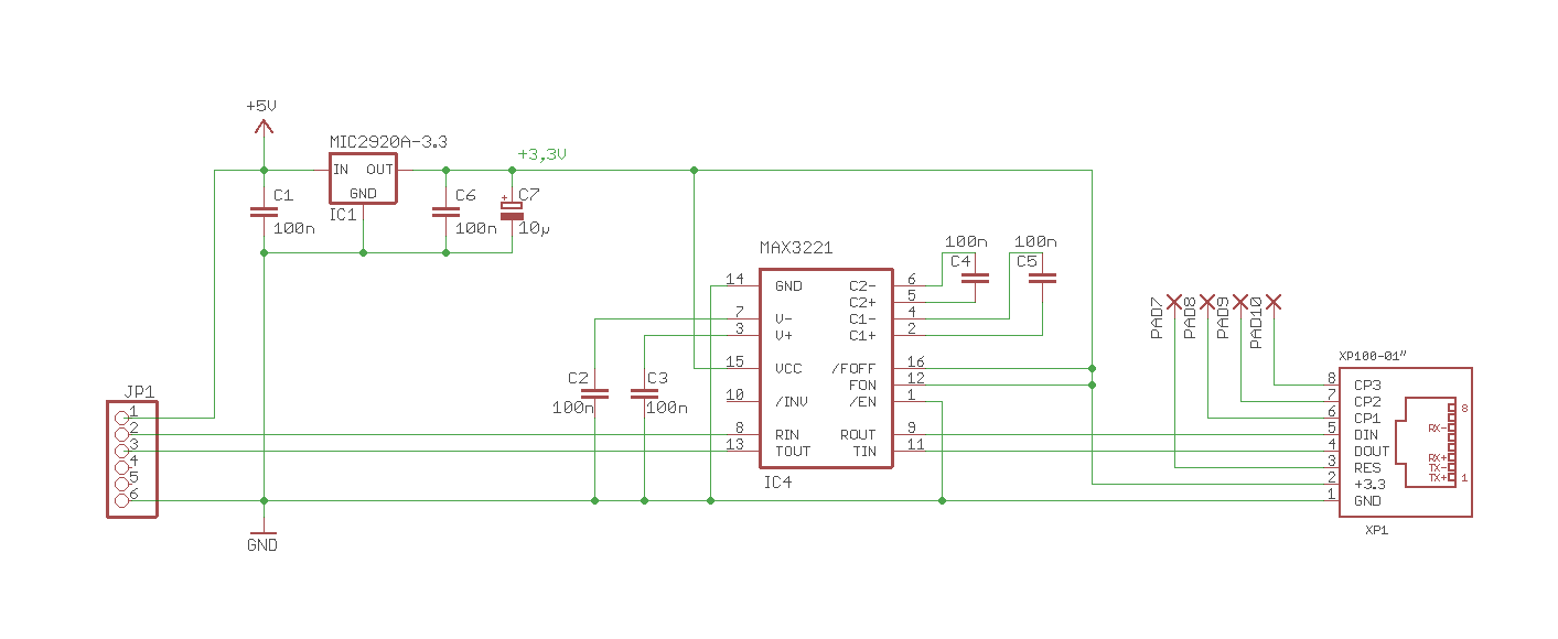 Welche Spannung gibt denn die Lüftungsanlage auf die seriellen Ein-/Ausgänge? Echtes RS232? Dann brauchst Du noch einen Pegelwandler, der aus dem RS-232 (+/-12V) die passenden Pegel (0/3,3V) für die Lantronix-Büchse macht. Also etwa so, wie auf dem Bild im Anhang. Wir verwenden hier auch Lantronix-X-Port, haben als Speisespannung aber nur 5V. Bei der Wandlung von 12V auf 3,3V könnte, je nach Last, der Spannungsregler sehr warm werden. Laut Datenblatt braucht der X-Port maximal ca. 267mA. Rechnet man das mal der Spannungsdifferenz (12V - 3,3V = 8,7V), bekommt man die Verlustleistung, die am Spannungsregler in Wärme umgewandelt wird: 0,267A * 8,7V = 2,32W. Das ist recht viel. Also entweder auf ausreichende Kühlung achten, oder gleich einen Schaltregler verwenden.