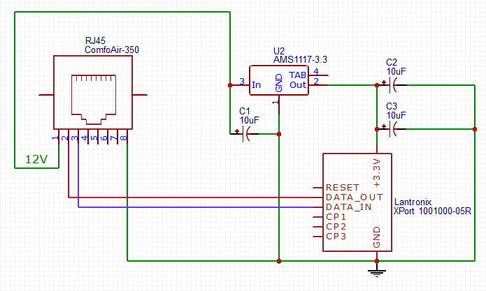 Ich überlege mir gerade, wie ich die ComfoAir Lüftungsanlage integriere, die hat im Prinzip nur einen seriellen Anschluss, ich habe aber wenig Lust, serielle Kabel durchs ganze Haus zu legen, deshalb bietet es sich an, die Anlage über Ethernet einzubinden. Ich bin auf den Lantronix XPort gestossen. Die ComfoAir bietet 12V Spannung, der Lantronix braucht 3,3. Die Spannung würde ich mit einem AMS1117-3.3 regulieren, mit der angehängten Schaltung. Machbar oder habe ich etwas übersehen?