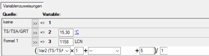 - Im Modul, an das der Temperatursensor angeschlossen ist, ist Variable 2 mit dem Temperaturwert belegt. Dort einer anderen Variablen folgende Formel zuweisen: (Var2 (TS/TSA/GRT) x 1 + 5)/1 (s. Bild). Die Formel verarbeitet die Werte im LCN-Format, +5 entsprechen dabei +0,5 °C.