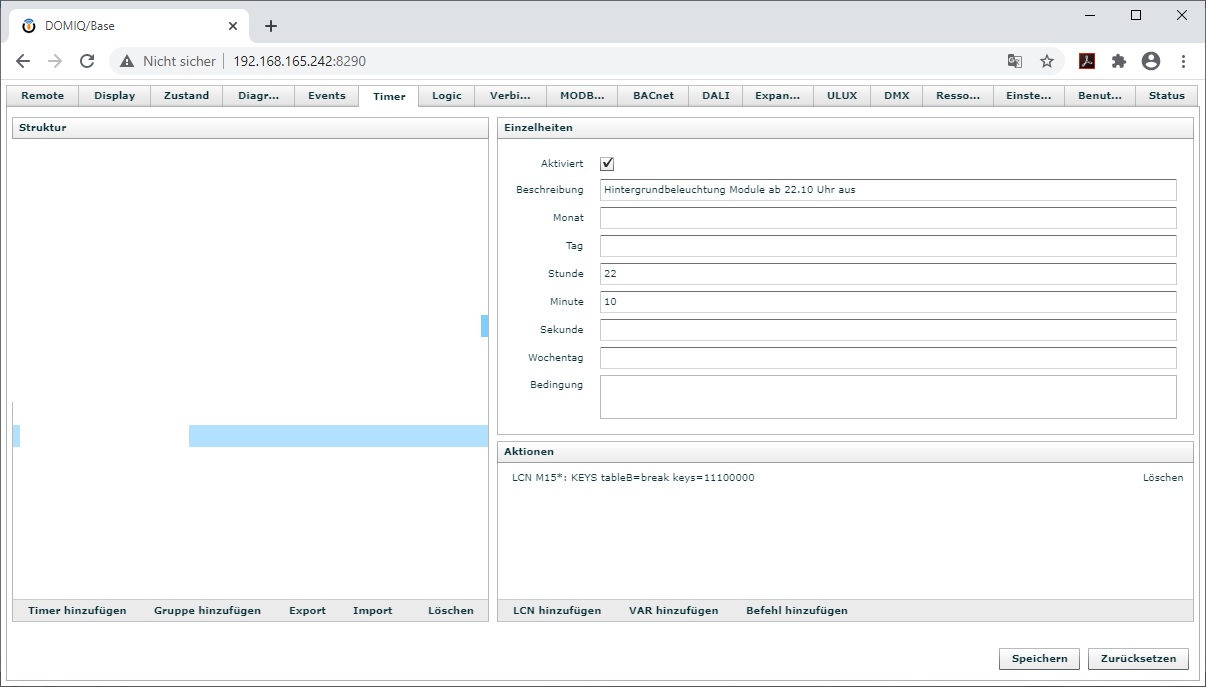 Du kannst in der Oberfläche vom DOMIQ unter Tabulator "Timer" Deine Werte, Bedingungen und Kommandos eintragen.