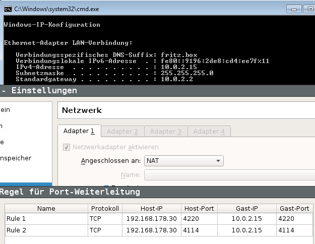 Portweiterleitung für TCP Ports 4114 und 4220 in der VirtualBox eingetragen?