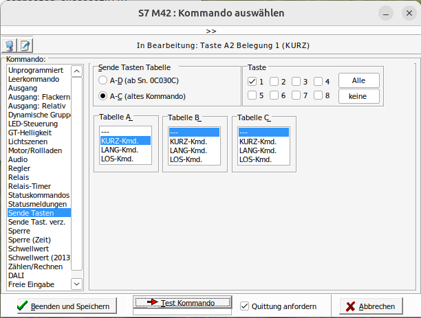 + Ich habe mir damit beholfen, dass die Taste A1 (Kurz) dann die Taste C8 (kurz) triggert, was ich dann auch in LCN-Pro sehe.