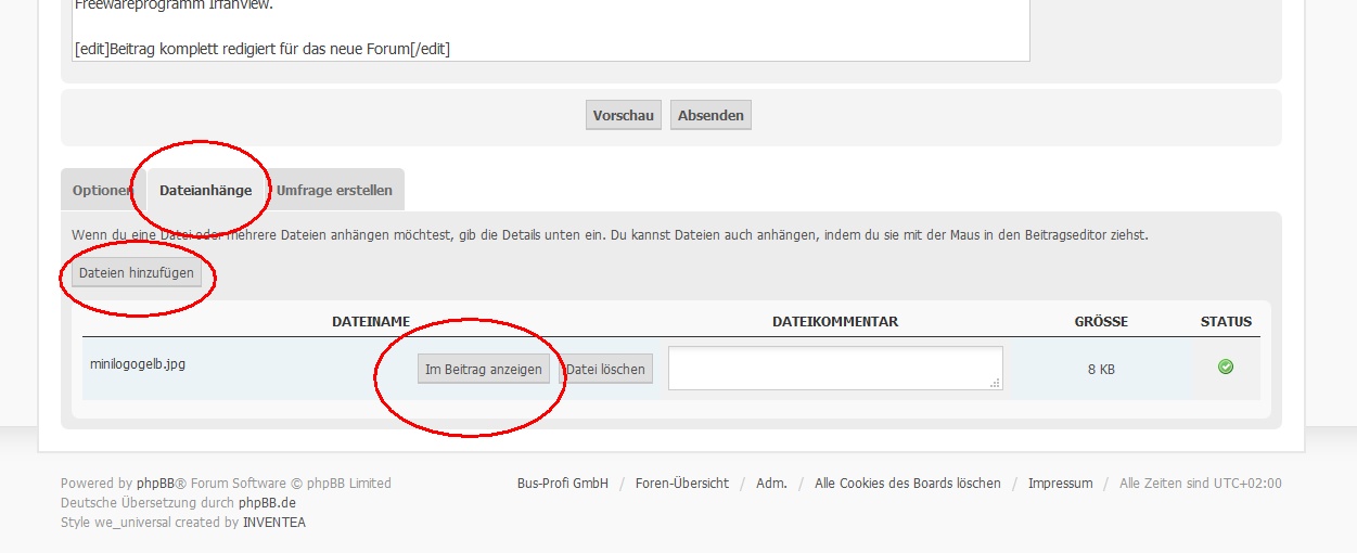 Wer ein Bild ins seinen Beitrag einfügen möchte, muss es einmal einen Dateianhang hochladen. Befindet sich der Cursor an der richtigen Stelle, kann man auf den Button Im Beitrag aneigen drücken, ein passender Link wird dann an dieser Stelle eingefügt. Es können nicht alle Dateiarten hochgeladen werden, ebenso ist die maximale Größe der Datei begrenzt.