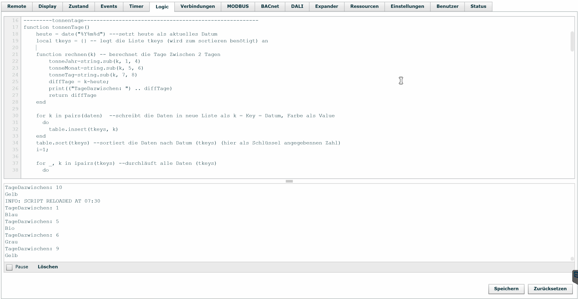 Dann habe ich folgenden Code in LUA in den Bereich "Logic" der Base geschrieben:
