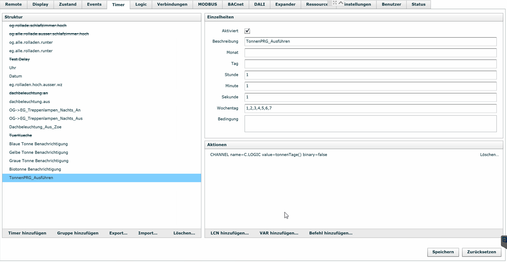 Jetzt muss man noch unter "Timer" das Programm "tonnenTage()" aus der Logic ausführen, damit die Zahlen in der Visu aktualisiert werden. Das mach ich mit einem Timer, der jeden Tag um 1:11 Uhr ausgeführt wird.