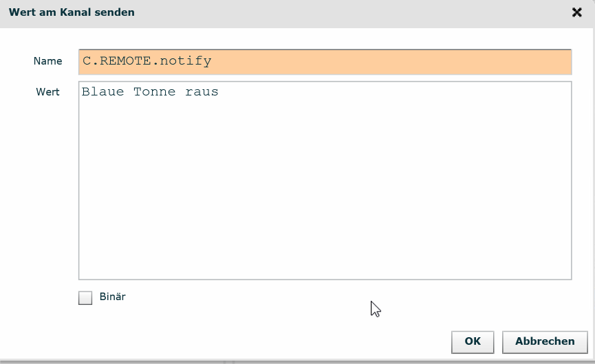 Wert: einen Wunschtext. Bei mir: Blaue Tonne raus (geht auch netter :P )