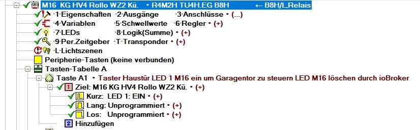 Hallo Uwe, danke für die Info aber das scheint nicht das Problem zu sein. Der Tastendruck geht nicht verloren. Ich versuche es mal anders zu beschreiben. Ich hoffe es wird nicht zu kompliziert. Ich setze die LED 1 im Modul 16 durch den Tastendruck. Das Garagentor bleibt zu. Öffne ich mit der rechten Maustaste im Kontextmenü von Modul 16 den Status (im lcn pro) öffnet sich das Garagentor. Es sieht so aus, als ob die LED erst mit dem öffnen des Status gesetzt wird. Hast Du eine Idee, wie ich das anders überprüfen kann? Zum Testen lass ich durch den Taster einfach das Licht bei mir im Arbeitszimmer Anschalten. Und siehe da es funktioniert (mit dem selben Script im ioBroker nur eben mit der Abfrage auf Licht Arbeitszimmer). Es muss also irgendetwas mit der LED zu tun. Prinzipiell wird der Status der LED also auch an den ioBroker übertragen aber komischer Weise erst, wenn ich lcn pro öffne und dann auch erst wenn ich den Status des Moduls in dem ich die LED setzte abrufe. Auch das dauert dann solange, bis der Status der LED abgerufen wird. Die Status der anderen Felder, die vorher zur Anzeige abgerufen werden reichen nicht. Erst wenn LED1 im Status angezeigt wird öffnet das Garagentor. Ich kann natürlich auch ein nicht belegtes Relais (nicht virtuell) schalten lassen und das abfragen. Aber als Ingenieur würde ich schon gerne wissen, warum das mit der LED nicht klapp. Grundsätzlich funktioniert die Lösung ja nur die Aktualisierung der LED scheint erst auf Abruf des Status zu gekoppelt zu sein. Wie könnte ich das rein LCN seitig überprüfen ohne den Status der LED abzurufen?