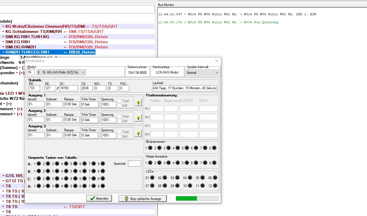 Man kann aber den Zustand der LEDs abfragen (teilweise immer noch als "Tableaulämpchen" bezeichnet), dafür gibt es extra ein PCK-Kommando. Ist in LCN-PRO der Modulstatus zu einem Modul geöffnet, macht LCN-PRO genau das alle paar Sekunden. Und die Antwort des Moduls auf diese Abfrage scheint auch ioBroker auszuwerten.
