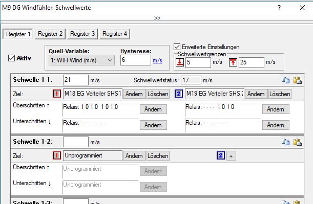 Der dann von der Schaltschwelle nach Anleitung programmierte Ausgang bringt eine weitere Zeitverzögerung in die Auslösung bzw. die Rückstellung des 'Windalarms'. Sonst würde mit jedem Nullstellen auch der Alarm zurückgesetzt.